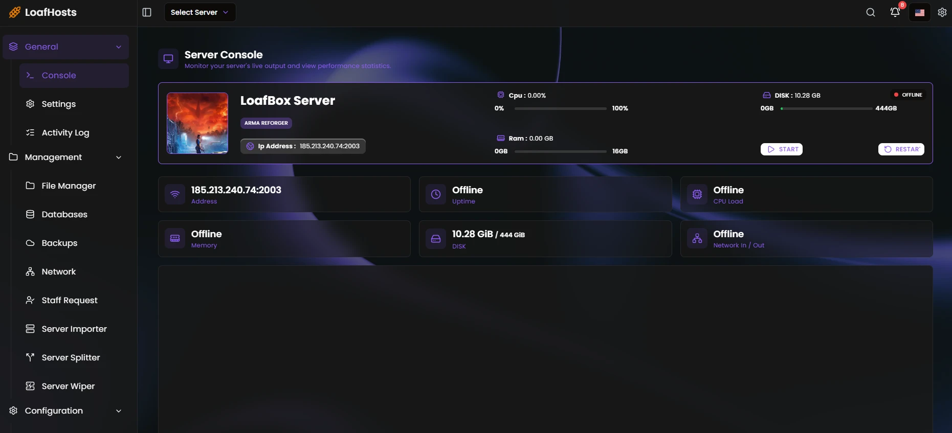 Monitor your server's live output, view performance statistics, and control your server with real-time CPU, RAM, and disk usage graphs.